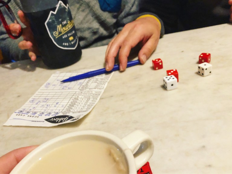 Upon deciding we wouldn’t be continuing on anytime soon, I remembered I had packed five dice and a few Yahtzee score sheets – one of the few things left in my bag that I hadn’t yet gotten use out of. And so the six of us played Yahtzee, holding onto mugs of hot tea and thinking about quitting for the day in between turns (but no one verbalized that last part).