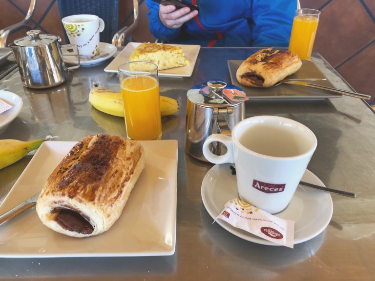 🍴:This is what a typical breakfast looks like here. Usually we wake up and hit the trail before cafes in our current town are open, so we stop for breakfast in the first town we pass through. Most places do some kind of incredibly reasonable combination meal with fresh orange juice + coffee / tea / hot chocolate + a pastry / breakfast sandwich / “tortilla” (that quiche looking thing towards the back of this photo. It’s essentially an omelet pie with eggs and potatoes and sometimes meat. Suuper good!).