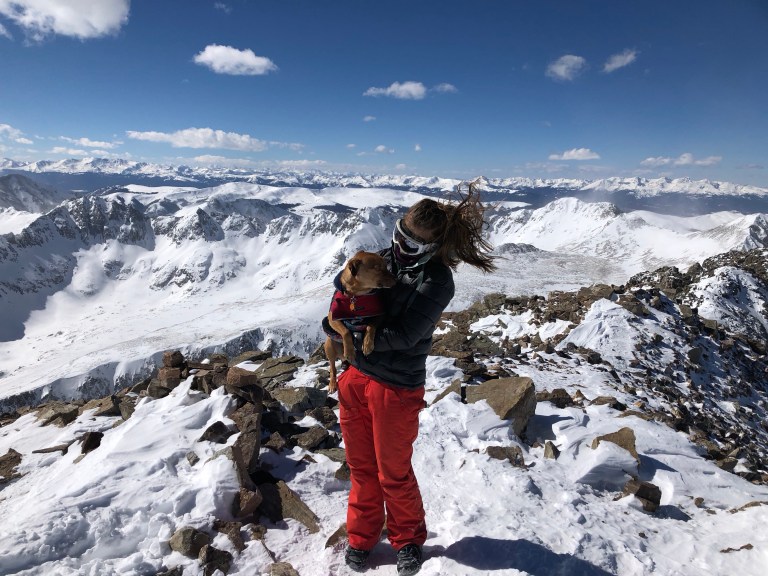 My friend, understandably, decided to turn around shortly after tree line for the well-being of her dog. After some discussion, I decided to keep going. My pup was still doing fine (we would’ve turned around had he shown any signs that indicated otherwise) and I had an absurd amount of determination. I kept putting one micro-spiked foot in front of the other, taking solace from the wind whenever possible. I eventually found myself sandwiched by incredible people. One man shared a trekking pole with me, I’m certain I would not have summited without his generosity. Another shared his sour skittles with me in exchange for my promise to share the contents of my flask with him at the top. And yet another exchanged phone numbers with me so that he could send me photos he took of the pup and I braving the ridge (main photo). We all became somewhat of a family, checking in with each other frequently as we all experienced this ridiculous amount of self-inflicted misery.