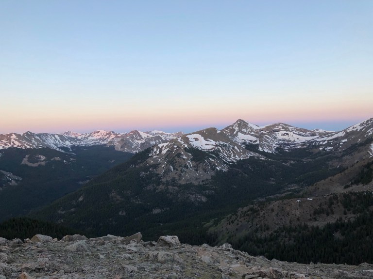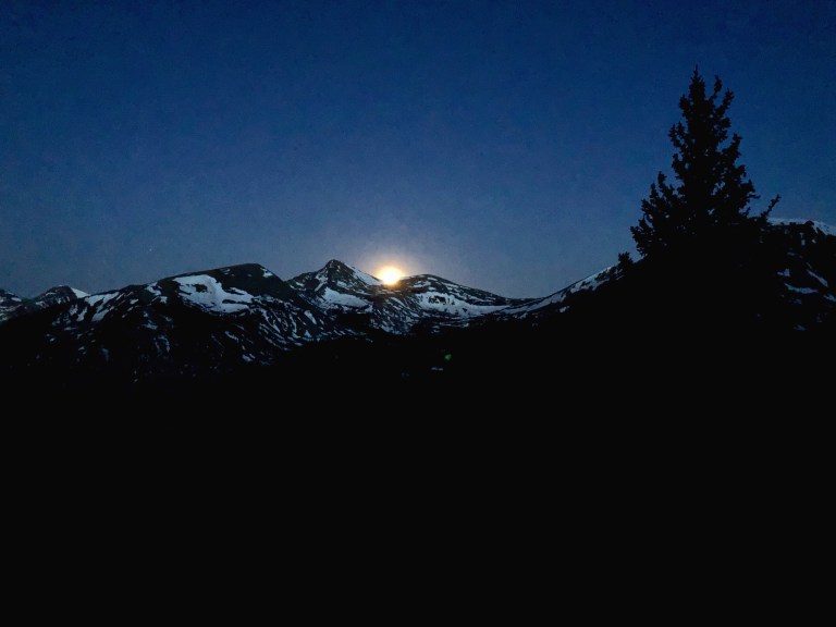 I slept surprisingly well and woke up to a fellow hiker arriving at the trailhead around 0315. Thankful to know there would be someone ahead of me on the trail, I began making my own preparations and Arlo and I were on the trail by 0345. The moon was so bright I kept mistaking it for a headlamp and turning around. I made it to tree line just before sunrise and found a perfect rock to sit on and enjoy panoramic views of the day beginning. It was at this point that I saw another person for the first time, we greeted each other with a nod and he continued on his way.