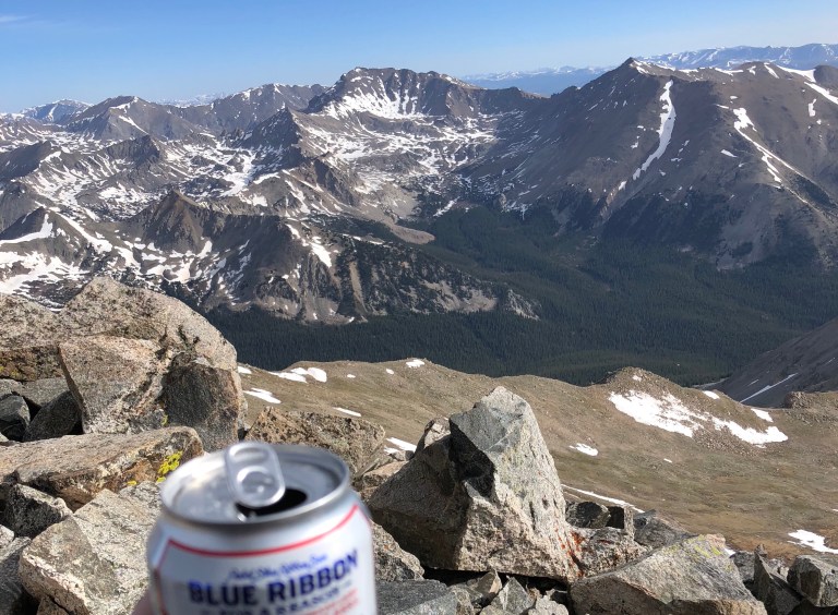 The remainder of the hike consisted of a few snow patches and then a few more awful switchbacks. I pressed on, with Dierks Bentley’s new song “The Mountain” appropriately on repeat (the whole album is a freaking incredible, for the record). I stopped at the top of the switchbacks to enjoy the sunlight and give Arlo’s new shoes a try. At that point, a second hiker passed me, we nodded at each other and he continued ahead. To my pleasant surprise, the summit came quickly after that and I was greeted by three guys, all of whom I assumed were around my age. One handed me a PBR and we all began the standard “how many have you climbed?” summit conversations.