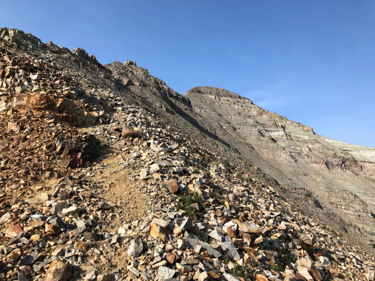As we climbed Castle Peak, we had noticed other hikers descending from the saddle between the two peaks instead of returning via the trail we were on. This is the route the hiking app I was using suggested and it was ideal in the sense that it meant we wouldn’t have to climb back up and over Castle Peak, but the significant lack of snow present made it a particularly sketchy-looking option. (You can see this section in the second photo I posted. The route can be seen above the large lower snow patch, my understanding is that this entire gully is typically filled with more snow, making it less of a literal scramble).