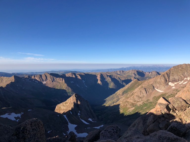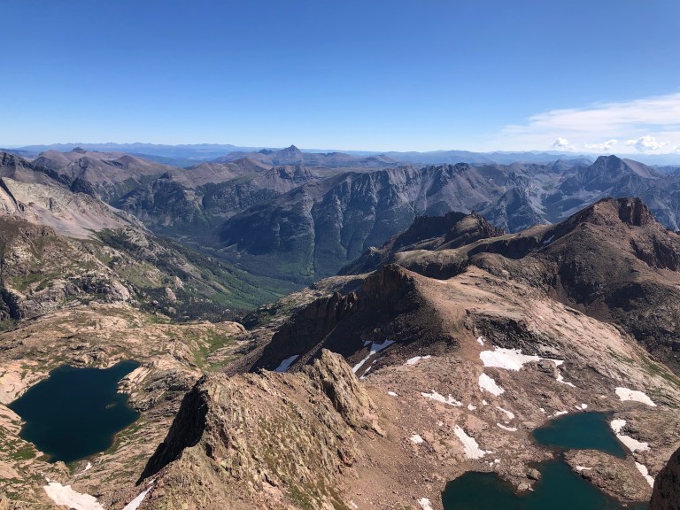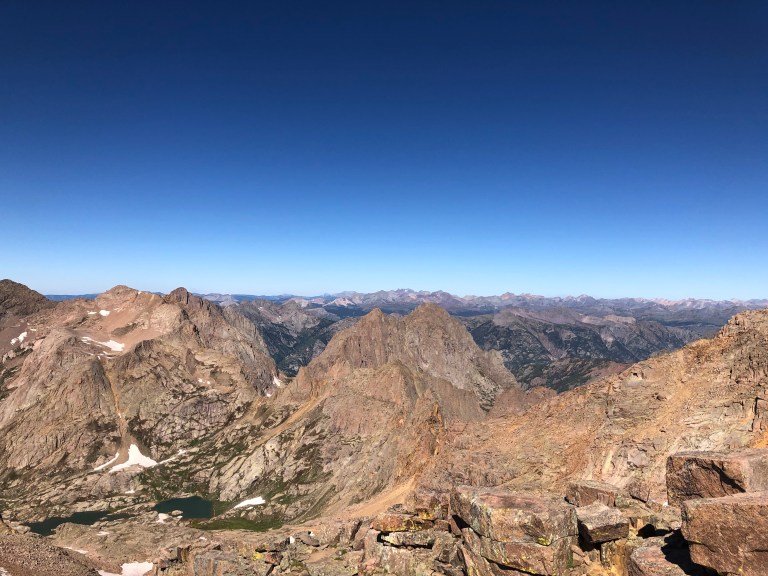 The traverse to and then up Windom was fairly anticlimactic and later that morning we stood on our second summit of the day. This was my favorite view of the entire day as we could see the Twin Lakes at the base as well as several other alpine lakes, the 360 views were wild with an incredible vantage point and we could see all of the mountains we had and would stand upon that day.