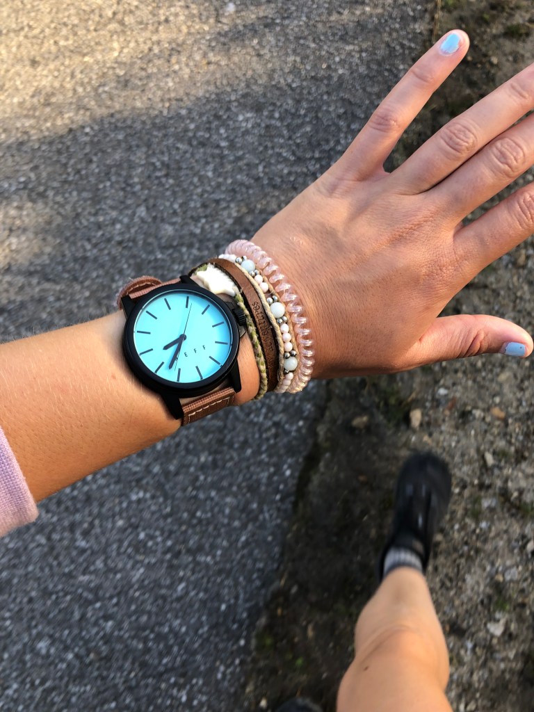 Last camino, I brought a few changes of earrings, two necklaces and the above green and white bracelet. This year, only these 👆🏽. My bobble, which reminds me of my cousin and a girl from my paramedic class, as they were who introduced me to these stellar hair ties. A bracelet one of my favorite companies (Thread Wallets) sent me just for the spoil-me heck of it, the brand escapes me but I will figure it out and edit this post. A bracelet a best friend gave me for Christmas that simply says “say yes to adventure.” My wanderer bracelet from my last camino – I bought my friend and I matching ones before we embarked. And finally, my Neff watch; one of my favorite people was nearby when I stumbled upon this and fell in love with its colors and he bought it for me as a birthday present. Last year, I used my garmin watch and routinely downloaded my steps. This year, I know I’m stepping a lot (and that it’s one of seven days of the week in September) and that is enough.