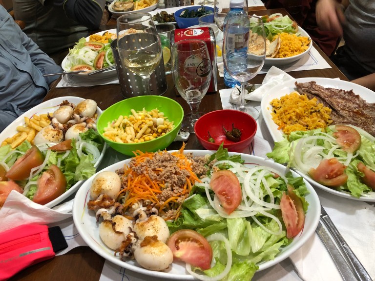 This was our dinner, a “pilgrims meal.” For 9β¬ we got a drink of any kind, unlimited bread and the pictured snacks, a meal with two sides (I tried cuttlefish with a tuna pasta salad and a salad). It also came with dessert and a post-dinner coffee. Oh and our waitress brought us a night cap, too (also dinner ended at 11pm).